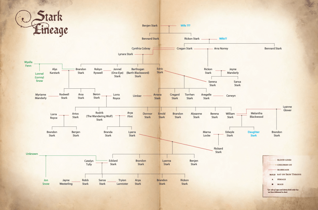 In addition to the famous and fabulously named King Edrick Snowbeard Stark, there are two other Eldric name variants in House Stark, both of whom lived in the last seven generations of House Stark. Although there isn’t much in the records about Elric Stark and the non-snowbearded Edric Stark, they certainly do occupy interesting places in the family tree. First, there’s Elric Stark; he had brothers named Brandon and Benjen, just as Eddard does, which is interesting because Ned is an Eldric figure as well, by way of the Daynes considering Edric a variant of Eddard. Elric Stark turns out to be the cousin of Cregan Stark, whose son was the Edric Stark, the non-Snowbearded one. That Edric also has a brother named Brandon, which, of course, that’s hardly remarkable with as many Brandon Starks as there are, but he also has a sister named Lyanna, as Ned does, as well as a more famous brother named Barthogen – that’s our boy Barth Blacksword, who later became Lord of Winterfell.