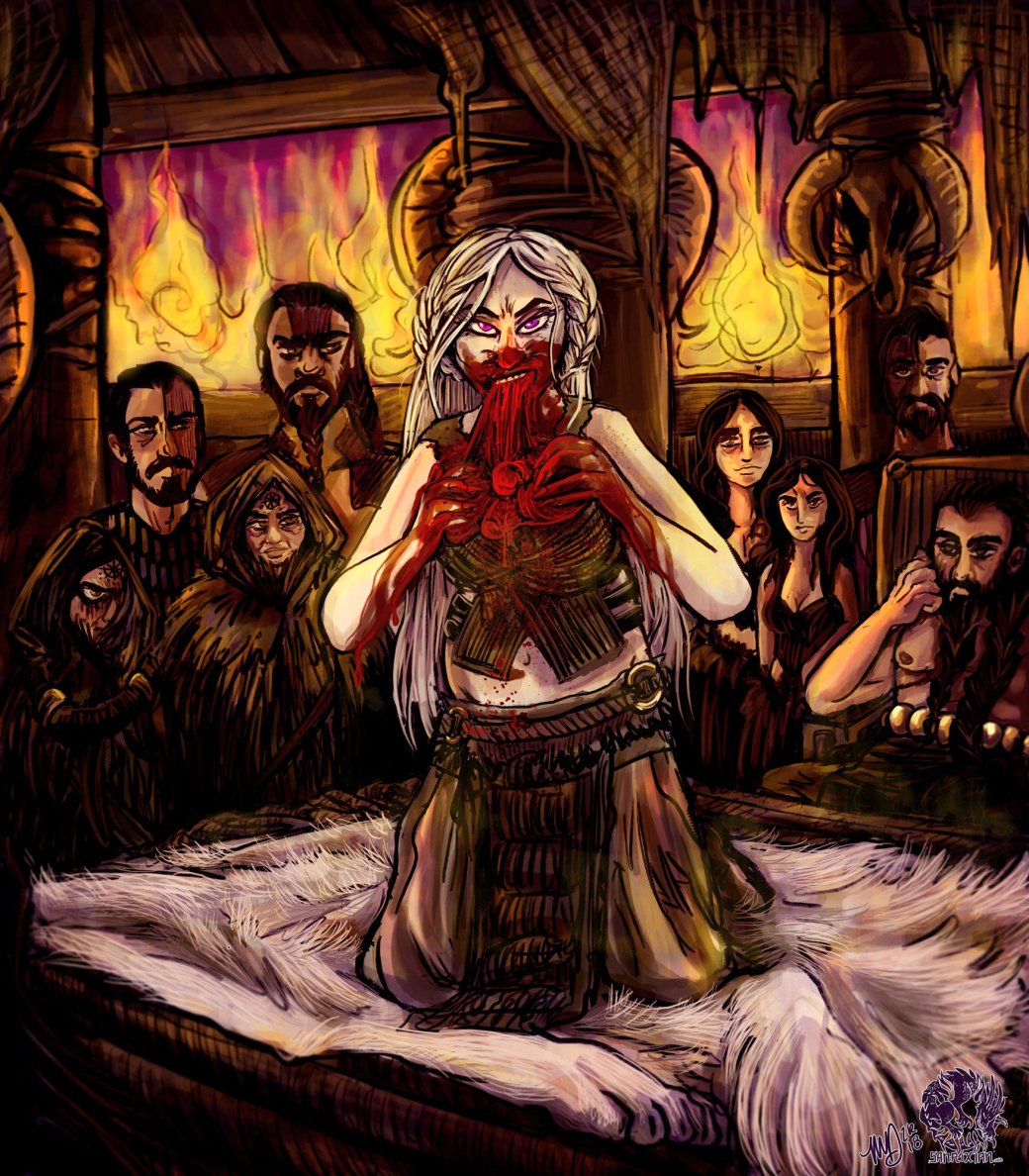 Ygritte’s boiling also reminds us of Dany’s dreams of being immolated in dragonfire, with her flesh melting and sloughing off her bones in the same fashion. They are both dying Nissa Nissa figures, entering the sea of green fire, in a manner of speaking, and filling it with blood. They are losing their flesh – symbolic of their mortal life – to become only blood and bone, the look of a heart tree.